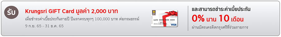 - เมื่อสมัครและชำระค่าเบี้ยประกัน กรุงศรีประกันสะสมทรัพย์ เซฟ แอนด์ แคร์ 18/5 แบบรายปี ปีแรก ทุกๆ 100,000 บาท ต่อกรมธรรม์ จะมีสิทธิ์ได้รับ Krungsri Gift Card มูลค่า 2,000 บาท (ไม่จำกัดจำนวน) ผ่านสาขาของธนาคารกรุงศรีอยุธยา ระหว่างวันที่ 9 กันยายน 2565 - 31 ธันวาคม 2565 และกรมธรรม์ต้องได้รับการอนุมัติภายใน 30 วัน นับจาก วันที่ชำระเบี้ยประกันภัย