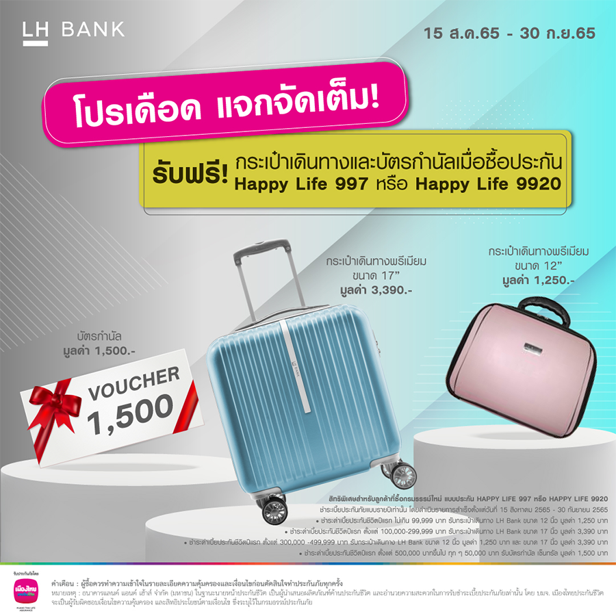 โปรเดือด แจกจัดเต็ม! รับฟรี กระเป๋าเดินทาง และบัตรกำนัลเมื่อซื้อประกัน HAPPY LIFE 997 หรือ HAPPY LIFE 9920 และชำระเบี้ยประกันแบบรายปี