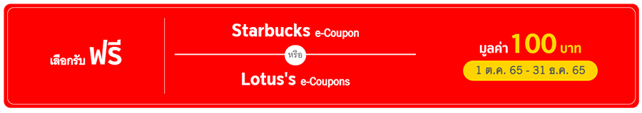 - จำกัดการเลือกรับของกำนัล 20,000 สิทธิ์ ได้แก่ Lotus’s e-Coupons จำกัดจำนวน 10,000 สิทธิ์ หรือ Starbucks e-Coupon จำกัดจำนวน 10,000 สิทธิ์ และจำกัดคนละ 1 สิทธิ์ ตลอดระยะเวลารายการส่งเสริมการขาย