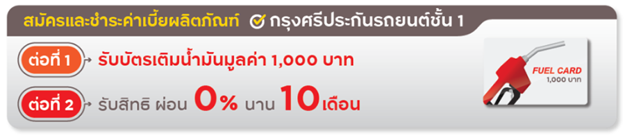 สิทธิพิเศษต่อที่ 1 รับบัตรเติมน้ำมันมูลค่า 1,000 บาท เมื่อสมัครและชําระเบี้ยประกันภัย ผลิตภัณฑ์กรุงศรี ประกันรถยนต์ ชั้น 1 รายใหม่และรายต่ออายุ ผ่านธนาคารกรุงศรีอยุธยา ทุกสาขา ระหว่างวันที่ 1 ตุลาคม 2565 - 31 ธันวาคม 2565
