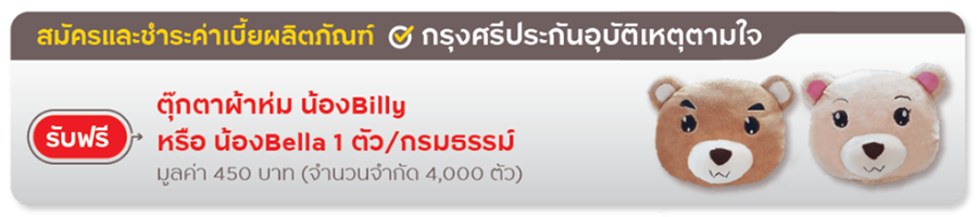 กรุงศรีประกันอุบัติเหตุตามใจ : รับฟรี! ตุ๊กตาผ้าห่ม น้อง Billy หรือน้อง Bella 1 ตัวกรมธรรม์ มูลค่า 450 บาท