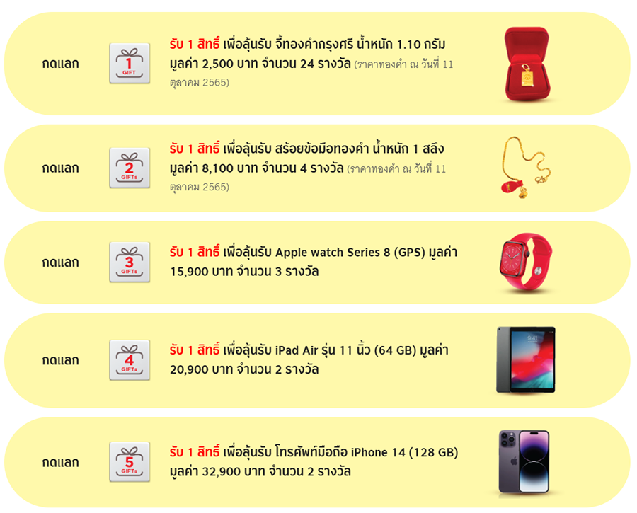 - ของรางวัลจะแบ่งเป็น 5 ประเภทสำหรับการจับรางวัลจำนวน 5 กอง ได้แก่ กองที่ 1 ประเภทจี้ทองคำกรุงศรี น้ำหนัก 1.10 กรัม มูลค่า 2,500 บาท (ราคาทองคำ ณ วันที่ 11 ตุลาคม 2565) จำนวน 24 รางวัล, กองที่ 2 ประเภทสร้อยข้อมือทองคำ น้ำหนัก 1 สลึง มูลค่า 8,100 บาท (ราคาทองคำ ณ วันที่ 11 ตุลาคม 2565) จำนวน 4 รางวัล, กองที่ 3 ประเภท Apple watch Series 8 (GPS) มูลค่า 15,900 บาท จำนวน 3 รางวัล, กองที่ 4 ประเภท iPad Air รุ่น 11 นิ้ว (64 GB) มูลค่า 20,900 บาท จำนวน 2 รางวัล และกองที่ 5 ประเภทโทรศัพท์มือถือ iPhone 14 (128 GB) มูลค่า 32,900 บาท จำนวน 2 รางวัล ของรางวัลรวมมูลค่าทั้งสิ้น 247,700 บาท
