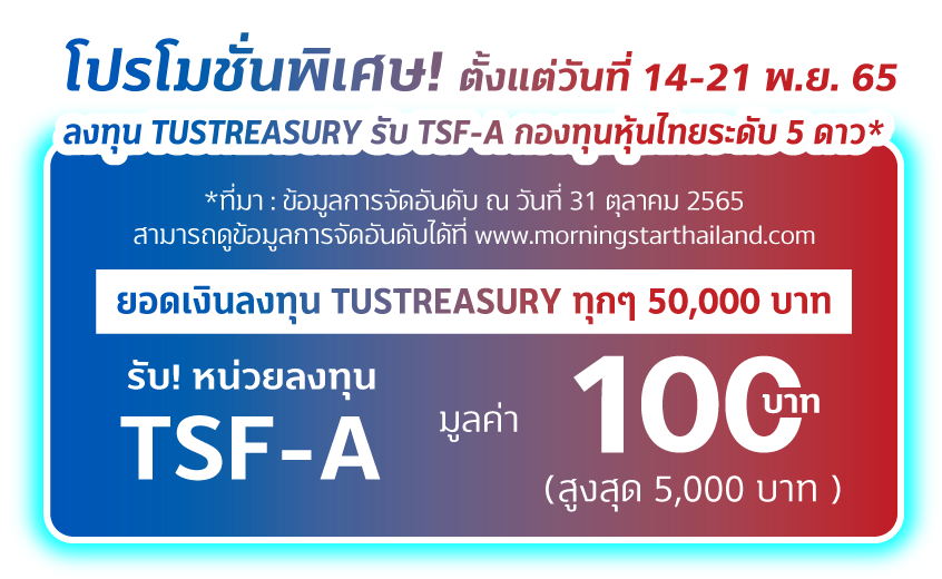 โปรโมชันพิเศษ! ลงทุน TUSTREASURY ทุกๆ 50,000 บาท รับหน่วยลงทุน TSF-A กองทุนหุ้นไทยระดับ 5 ดาว มูลค่า 100 บาท* (สูงสุด 5,000 บาท)
