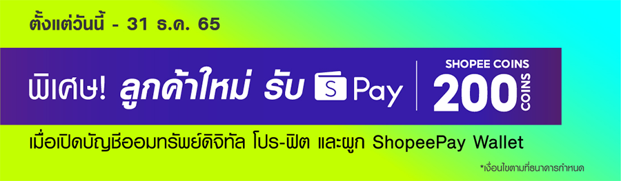 ทั้งนี้ ลูกค้าสามารถเลือกผูกบัญชีผ่านช่องทางใดช่องทางหนึ่งก็ได้ภายในระยะเวลาที่กำหนดข้างต้น โดยเงื่อนไขการผูกบัญชี ShopeePay Wallet เป็นตามที่บริษัทฯ กำหนดเท่านั้น - ลูกค้าจะได้รับ Shopee Coins เข้าบัญชี ShopeePay Wallet จำนวน 200 Coins ภายใน 15 วันทำการ นับจากวันสุดท้ายของเดือนที่ลูกค้าได้ทำการผูกบัญชีออมทรัพย์ดิจทัล Pro-Fit เข้ากับบัญชี ShopeePay Wallet