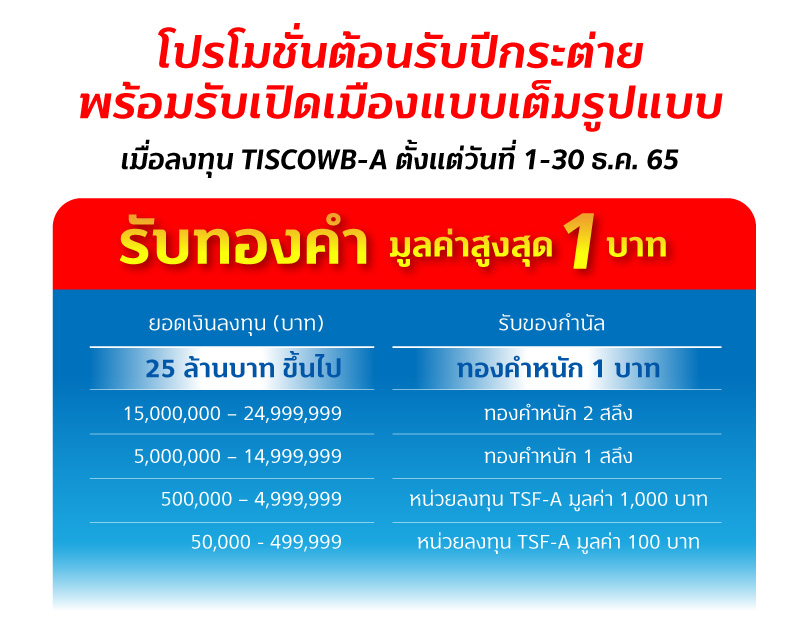 - สงวนสิทธิ์สำหรับลูกค้าบุคคลธรรมดาที่มียอดลงทุนสะสมในกองทุนเปิด ทิสโก้ Well-being ชนิดผู้ลงทุนทั่วไป (TISCOWB-A) ตั้งแต่วันที่ 1 – 30 ธ.ค. 65 โดยลูกค้าที่มียอดเงินลงทุนตามเงื่อนไขจะได้รับของกำนัลสูงสุด 1 ท่าน/ 1 สิทธิเท่านั้น