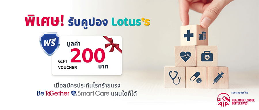 - รับบัตรของขวัญ Lotus มูลค่า 200 บาท ภายใน 30 วัน นับจากวันสุดท้ายของเดือนที่อนุมัติกรมธรรม์