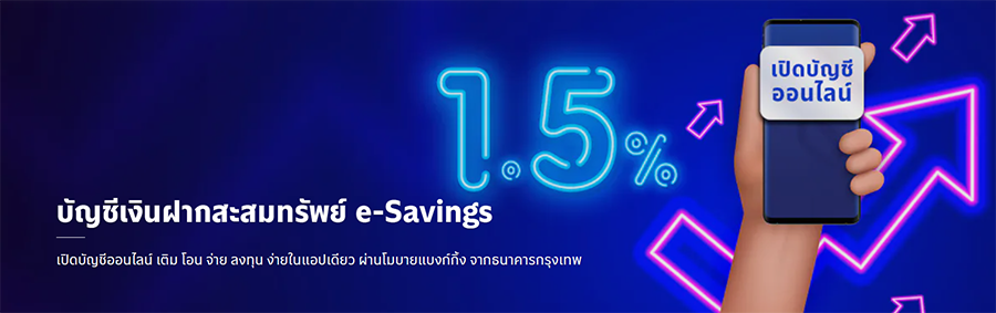 - สิทธิพิเศษนี้สำหรับลูกค้าที่เปิดบัญชี e-Savings พร้อมสมัครโมบายแบงก์กิ้ง จากธนาคารกรุงเทพ และทำรายการฝาก ถอน โอน เติม จ่าย รายการใดก็ได้ ผ่านช่องทางบริการของธนาคาร ครบ 2 รายการ ภายใน 7 วันนับจากวันที่เปิดบัญชี e-Savings สำเร็จ ตั้งแต่วันที่ 15 ธ.ค. 65 - 31 ม.ค. 66 (ไม่รวมถึงกรณีเคยสมัครใช้บริการโมบายแบงก์กิ้ง จากธนาคารกรุงเทพและยกเลิกแล้ว ต่อมากลับมาสมัครใหม่)