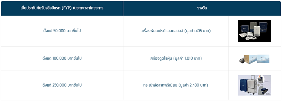 - สงวนสิทธิ์เฉพาะกรมธรรม์ประกันชีวิต ที่มีเบี้ยประกันภัยรับจริง (FYP) ตามที่ระบุไว้ในตารางข้างต้นเท่านั้น โดยจะได้รับของรางวัลโครงการตามที่กำหนดต่อ 1 กรมธรรม์ที่เข้าเงื่อนไข
