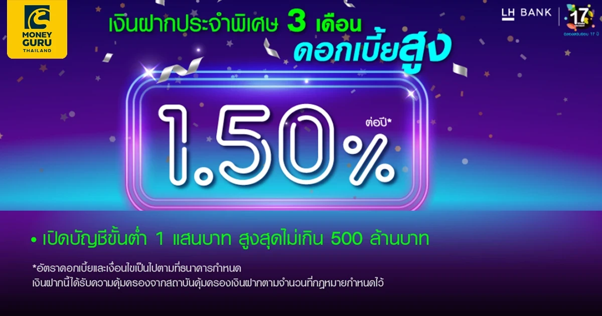 เเคมเปญเงินฝากประจำพิเศษ 3 เดือน ฉลองครบรอบ 17 ปีธนาคาร LH Bank วงเงินเปิดบัญชีครั้งแรก หรือฝากเพิ่มแต่ละครั้งขั้นต่ำ 100,000 บาทขึ้นไป ให้อัตราดอกเบี้ยสูงกว่าบัญชีออมทรัพย์