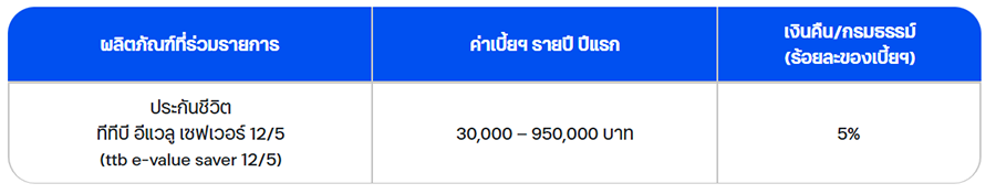 เงื่อนไขโปรโมชันเงินคืนสำหรับผลิตภัณฑ์ประกันชีวิตแบบสะสมทรัพย์ออนไลน์ ทีทีบี อีแวลู เซฟเวอร์ 12/5