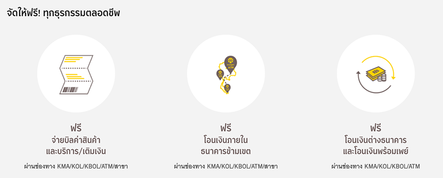 - ฟรี โอนเงินต่างธนาคาร และโอนเงินพร้อมเพย์ ผ่านช่องทาง KMA/KOL/ATM