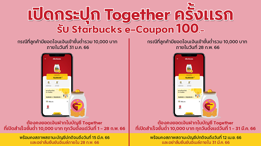 - ลูกค้าที่มียอดโอนเงินเข้าขั้นต่ำรวม 10,000 บาท ในกระปุก Together ที่เปิดครั้งแรกภายในวันที่ 31 มกราคม 2566 และทำครบเงื่อนไข จะได้รับ Starbucks e-Coupon มูลค่า 100 บาท ผ่านทางอีเมลที่ได้ลงทะเบียนไว้ในวันที่ 15 มีนาคม 2566 โดยเป็นลูกค้าที่ทำรายการสำเร็จครบถ้วน และลงทะเบียนยืนยันอีเมลสำเร็จตามเงื่อนไขที่กำหนด