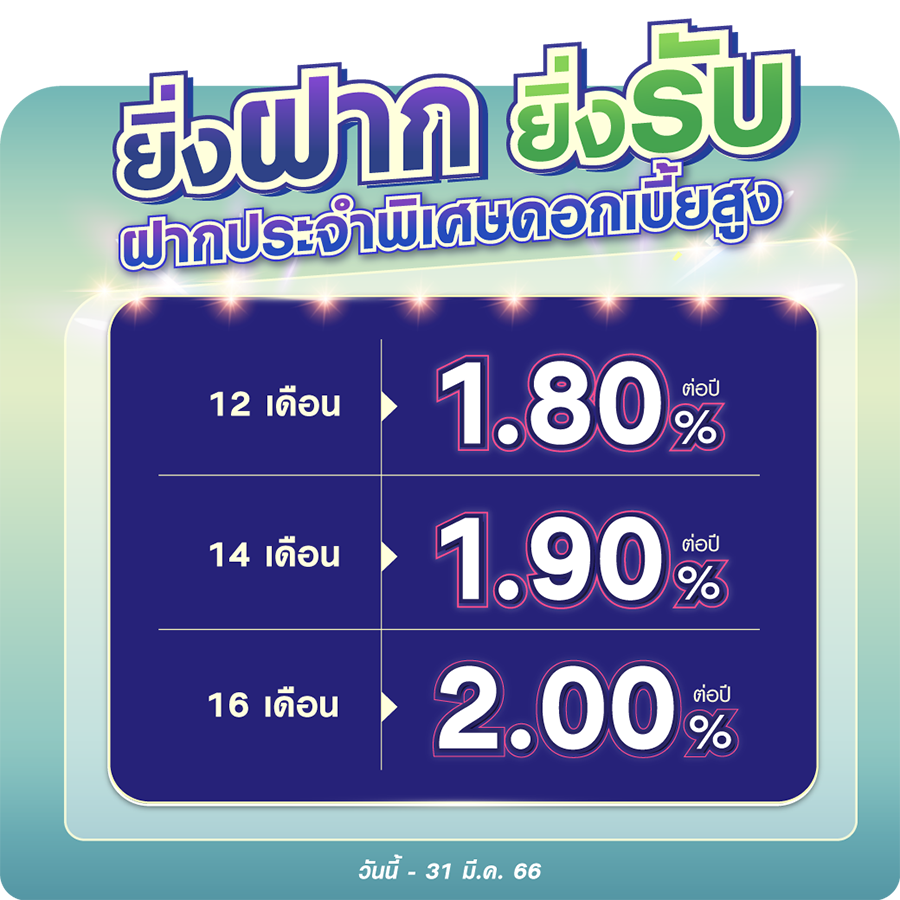 - ระยะเวลารับฝาก ตั้งแต่วันที่ 14 กุมภาพันธ์ ถึง 31 มีนาคม 2566 หรือจนกว่ายอดเงินฝากรวมทั้งแคมเปญครบ 15,000 ล้านบาท