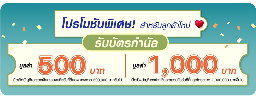 โปรโมชันพิเศษ! สำหรับลูกค้าใหม่ เมื่อเปิดบัญชี และฝากเงินสะสมตามที่กำหนด รับบัตรกำนัล ดังนี้