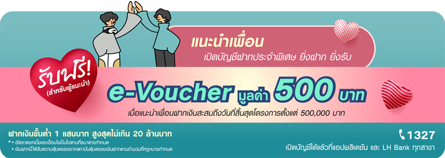 เเนะนำเพื่อน เปิดบัญชีฝากประจำพิเศษ ยิ่งฝาก ยิ่งรับ รับฟรี! e-Voucher มูลค่า 500 บาท เมื่อเเนะนำเพื่อนฝากเงินสะสมถึงวันที่สิ้นสุดโครงการตั้งเเต่ 500,000 บาท