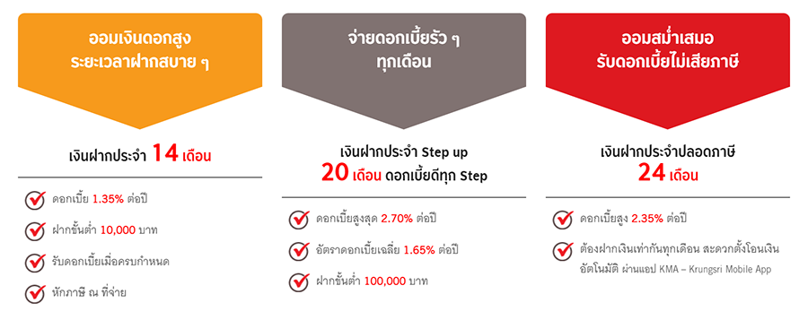 - ธนาคารจะจ่ายดอกเบี้ย เมื่อครบกำหนดระยะเวลา การฝากในอัตราดอกเบี้ยเงินฝากประจำ 24 เดือน (บุคคลธรรมดา) บวกด้วยร้อยละ 0.80 ต่อปี (สำหรับระยะเวลาการฝาก 24 เดือน) หรือในอัตราดอกเบี้ยเงินฝากประจำ 36 เดือน (บุคคลธรรมดา) บวกด้วยร้อยละ 0.50 ต่อปี (สำหรับระยะเวลาการฝาก 36 เดือน) ตามประกาศธนาคารที่ใช้บังคับอยู่ ณ วันที่ฝากเงินในแต่ละงวด