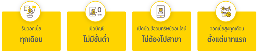 - สิทธิพิเศษนี้สำหรับลูกค้าที่เปิดบัญชีออมทรัพย์ มีแต่ได้ออนไลน์ ผ่านทาง KMA – Krungsri Mobile Application และมีธุรกรรมการโอนเงินเข้าบัญชีออมทรัพย์ มีแต่ได้ ออนไลน์ ในเดือนที่เปิดบัญชี ครั้งแรกขั้นต่ำ 200 บาทขึ้นไป ระหว่างวันที่ 1 เมษายน 2566 – 30 มิถุนายน 2566 เท่านั้น