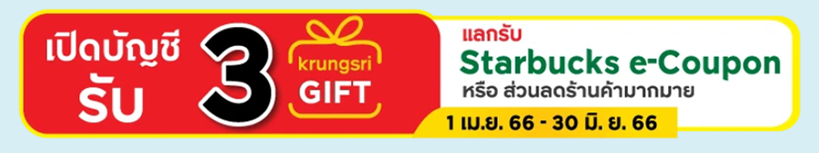 โดยสามารถใช้สิทธิ์ Krungsri GIFT แลก Starbucks e-Coupon มูลค่า 100 บาท (จำกัด 20,000 สิทธิ์ ตลอดระยะเวลาส่งเสริมการขาย) หรือใช้สิทธิ์ Krungsri Gift แลกรับสิทธิพิเศษอื่นๆ ที่เมนู GIFT & Privileges
