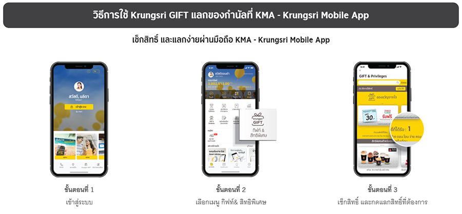 - ลูกค้าสามารถใช้ Krungsri GIFT แลกรับของกำนัลได้ผ่าน KMA – Krungsri Mobile Application โดยต้องแสดงรหัสที่ได้รับผ่านทางโทรศัพท์มือถือ ณ ร้านค้าที่ร่วมรายการภายในระยะเวลาที่กำหนด
