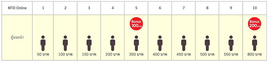 - รับโบนัสเพิ่มเมื่อแนะนำเพื่อนครบ 5 คน และ 10 คน รวมรับสูงสุด 800 บาทต่อเดือน