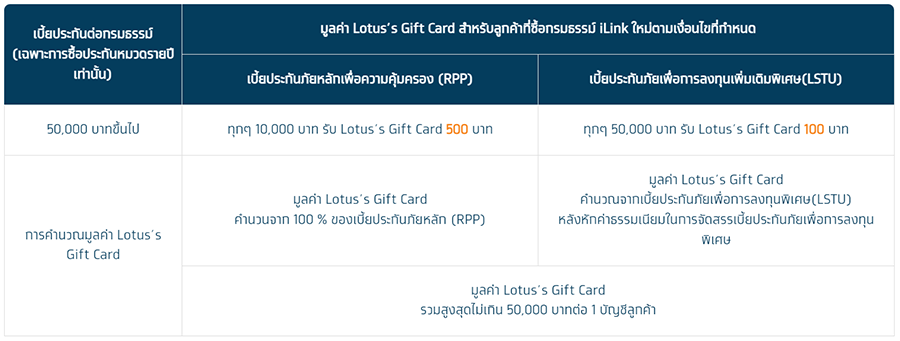 เลือกได้ทั้งเรื่องประกันชีวิต สุขภาพ และการลงทุน พร้อมรับ Lotus's GiftCard สูงสุด 50,000 บาท เมื่อซื้อผลิตภัณฑ์ iLink ตามเงื่อนไขที่กำหนด