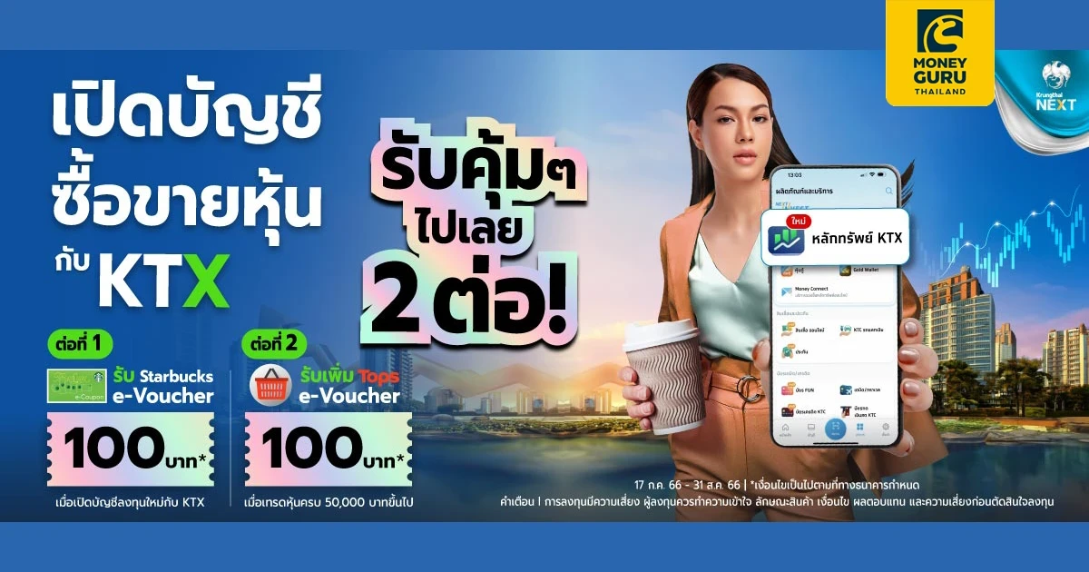 ต่อที่ 1 : รับ Starbucks e-Voucher มูลค่า 100 บาท เมื่อเปิดบัญชีซื้อขายหลักทรัพย์ใหม่กับ KTX ผ่านแอป Krungthai NEXT สำเร็จภายในระยะเวลาส่งเสริมการขาย