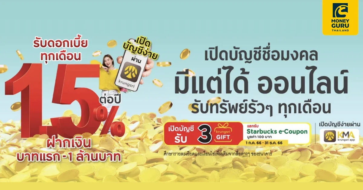 ธนาคารกรุงศรีอยุธยา จำกัด (มหาชน) ให้คุณรับทรัพย์ได้รัวๆ ต่อเนื่องทุกเดือน เมื่อเปิดบัญชีเงินฝากออมทรัพย์ "มีแต่ได้ ออนไลน์" ผ่านทาง KMA krungsri app ตั้งแต่การฝากเงินบาทแรก ถึง 1 ล้านบาท รับดอกเบี้ยทุกเดือน ด้วยอัตราดอกเบี้ย 1.5% ต่อปี และหากมีธุรกรรมการโอนเงินเข้าบัญชีออมทรัพย์ มีแต่ได้ ออนไลน์ ในเดือนที่เปิดบัญชีครั้งแรกขั้นต่ำ 200 บาทขึ้นไป ระหว่างวันที่ 1 กรกฎาคม 2566 - 31 ธันวาคม 2566 รับ Krungsri GIFT จำนวน 3 กิฟท์ แลกรับ Starbucks e-Coupon มูลค่า 100 บาท หรือส่วนลดร้านค้ามากมาย ที่เมนู GIFT & Privileges บน KMA krungsri app