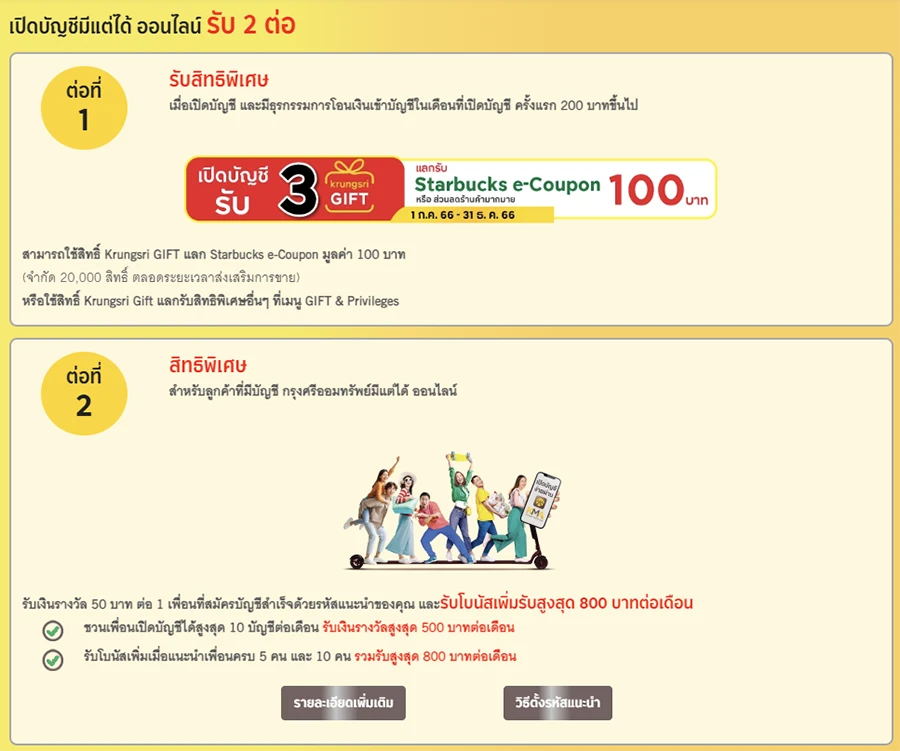 - สิทธิพิเศษนี้สำหรับลูกค้าใหม่ที่ยังไม่เคยเปิดบัญชีออมทรัพย์ มีแต่ได้ ออนไลน์ หรือลูกค้าที่เคยเปิดบัญชีออมทรัพย์ มีแต่ได้ ออนไลน์ และได้ปิดบัญชีก่อนวันที่ 1 กรกฎาคม 2566 เท่านั้น