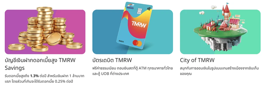 - บัญชีออมทรัพย์ TMRW ให้อัตราดอกเบี้ยปกติ 0.10%-1.3% ต่อปี อ้างอิงตามประกาศอัตราดอกเบี้ยเงินฝาก ณ วันที่ 15 กันยายน 2566 ดูข้อมูลล่าสุดได้ที่ https://www.uob.co.th/personal/announcement/index.page