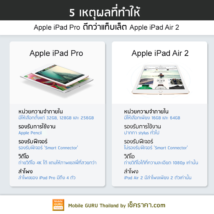 ทั้งนี้ นี่ก็เป็นเพียงจุดเด่นที่แตกต่างบางส่วนระหว่าง iPad Pro และ iPad Air 2 ที่ทำให้เครื่อง iPad Pro น่าหลงใหล และควรค่าแก่การครอบครอง ถึงแม้ว่าจะมีราคาสูงกว่าก็ตาม แต่ถ้าคุณกำลังมองหาแท็บเล็ตราคาไม่สูงนัก iPad Air 2 ก็เป็นทางเลือกที่ดีได้ไม่แพ้กัน อย่างไรก็ตาม ถ้าท่านผู้อ่านมีปัญหาการเลือกซื้อโทรศัพท์มือถือ และแท็บเล็ตมาให้เราแนะนำอีกละก็ สามารถติดต่อเข้ามาได้เฟชบุ๊กแฟนเพจ www.facebook.com/MobileGURUThailand