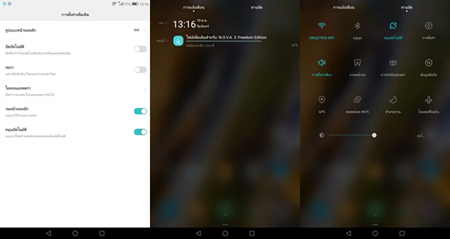 หน้า Home สามารถปรับแต่งได้มากมาย Wallpaper สามารถปรับความคมชัดได้ ช่วยให้ไอค่อนดูเด่นขึ้น และสามารถปรับแต่ง Transition ได้ถึง 8 รูปแบบ และสามารถปรับขนาดไอค่อนได้ 3 รูปแบบ ได้แก่ 4 x 5, 5 x 4, 5 x 5 มีฟังก์ชั่นเขย่าเครื่องเพื่อให้เรียงไอค่อนใหม่โดยอัตโนมัติ สามารถเลือกที่จะแสดงการแจ้งเตือนที่ไอค่อนแอปพลิเคชั่น โดยจะตั้งให้มีการแจ้งก็ได้ หรือปิดก็ได้สำหรับคนที่ไม่ชอบความรก สามารถปรับให้หน้า Home วนมากลับหน้าแรกได้ และการปรับหน้าจอให้แสดงผลเป็นแนวนอนจะอยู่ในการตั้งค่าตรงนี้นะครับ สำหรับ Notification จะแยกออกเป็น 2 หน้าโดยหน้าที่ 2 จะเป็นในส่วนทางลัดต่างๆ