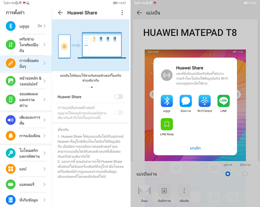 HUAWEI Share - HUAWEI MatePad T8 รองรับฟีเจอร์ HUAWEI Share ที่สามารถแบ่งปันไฟล์แบบไร้สายกับคอมพิวเตอร์ หรือสมาร์ทดีไวซ์อื่นๆ ในอีโคซิสเต็มของหัวเว่ย ไม่ว่าจะเป็นแท็บเล็ต โน๊ตบุ๊ก สมาร์ทวอทช์ และหูฟัง ได้อย่างสะดวกสบายแบบ One Tap และยังสามารถใช้ HUAWEI Share เพื่อสั่งพิมพ์ไฟล์ไปยังเครื่องพิมพ์ที่อยู่ใกล้ได้อีกด้วย เรียกได้ว่าใครที่ใช้สมาร์ทโฟนหรืออุปกรณ์ต่างๆ ของหัวเว่ยอยู่แล้ว ก็ยิ่งเพิ่มความง่ายในการใช้งานไปอีกเท่าตัวเลย