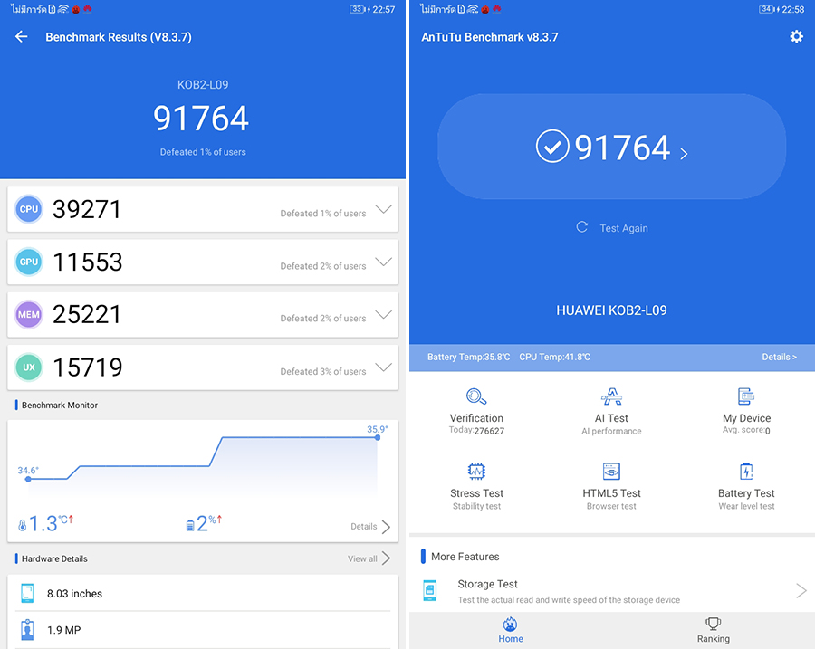 - ทดสอบด้วยแอปฯ AnTuTu Benchmark ได้คะแนน 91,764 คะแนน