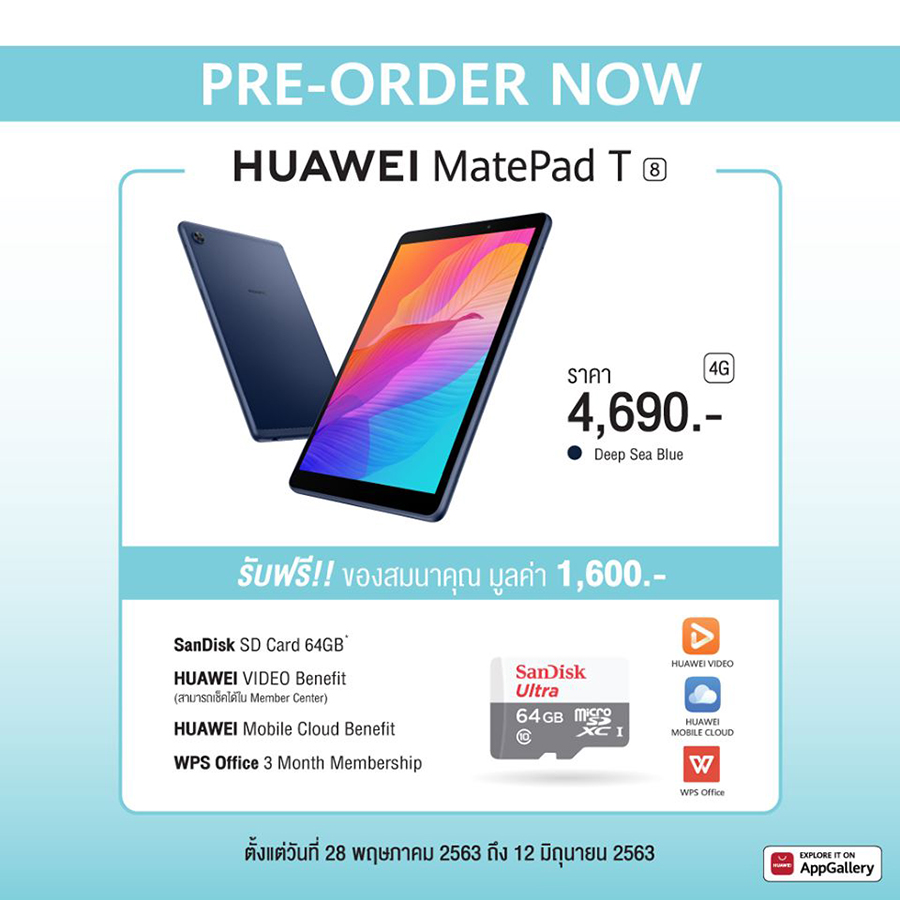 พิเศษ! เมื่อสั่งจอง HUAWEI MatePad T8 รุ่น 4G ราคา 4,690 บาท รับฟรี! SanDisk SD Card 64GB, HUAWEI VIDEO Benefit, HUAWEI Mobile Cloud Benefit และสมาชิก WPS Office ฟรี 3 เดือน รวมมูลค่า 1,600 บาท ตั้งแต่วันนี้ - 12 มิถุนายน 2563 เท่านั้น