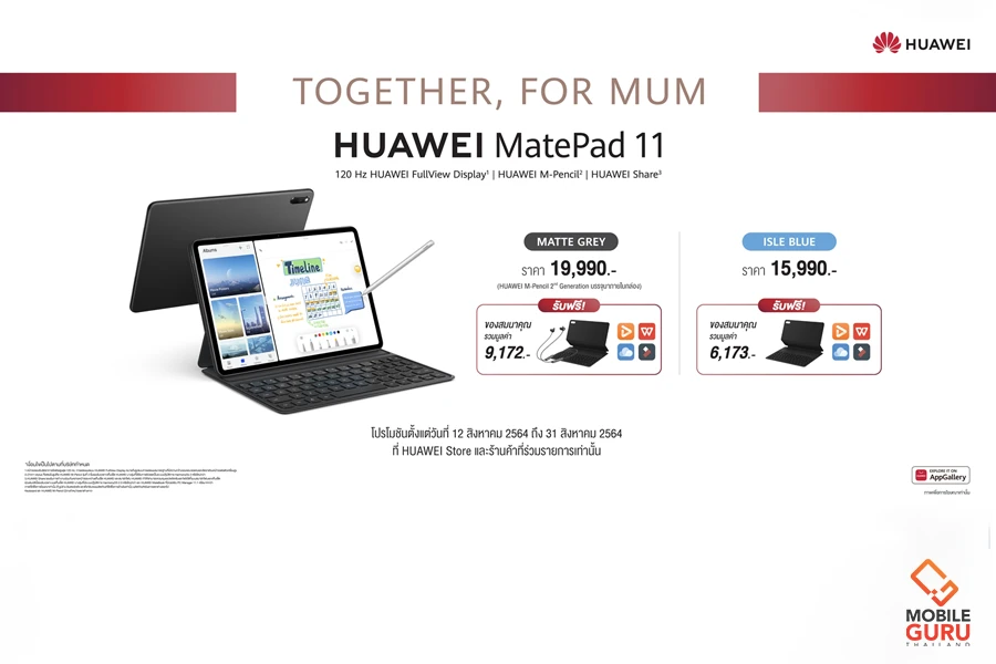- HUAWEI MatePad 11 หน่วยความจำ 6GB + 128GB (รุ่น WiFi) สี Matte Grey พร้อม HUAWEI M-Pencil (2nd generation) บรรจุภายในกล่อง ในราคา 19,990 บาท รับของสมนาคุณสุดคุ้มเป็น HUAWEI Smart Magnetic Keyboard, HUAWEI FreeLace Pro, สิทธิพิเศษจากแอปฯ ต่างๆ ได้แก่ HUAWEI Cloud 1 เดือน (50GB), HUAWEI Video VIP 1 เดือน, WPS Office VIP 3 เดือน และ FilmoraGo HD VIP 3 เดือน มูลค่ารวม 9,172 บาท*
