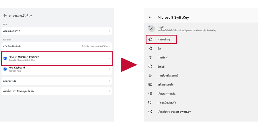 - เลือกที่ Microsolf SwiftKey Keyboard จากนั้นให้เลือกที่ Languages (ภาษาต่างๆ)