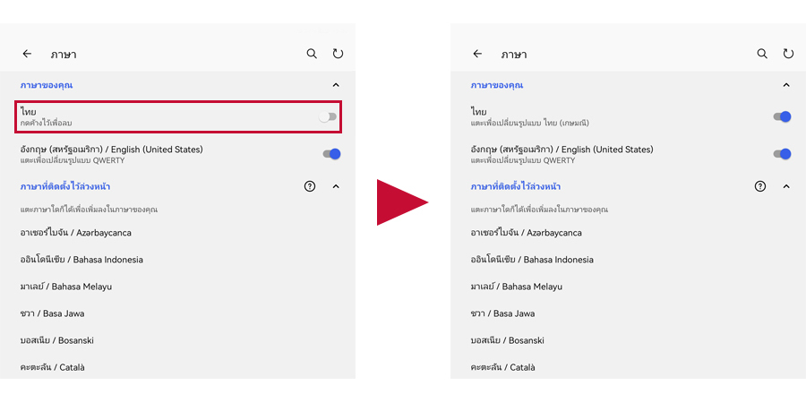 - เลือกติดตั้งภาษาดังกล่าว กดแป้นลัด Ctrl+Shift เพื่อเปลี่ยนภาษาและทดลองพิมพ์ใช้งานได้ทันที