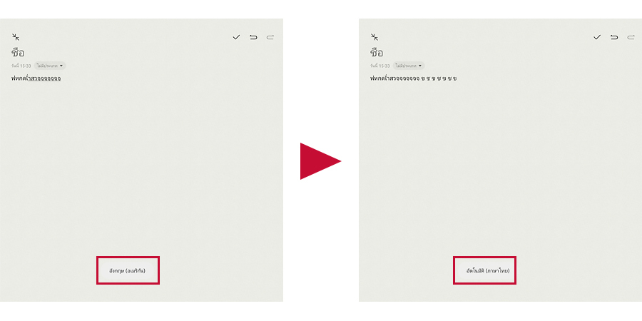 - ให้สังเกตสัญลักษณ์ที่ขึ้นมาระหว่างการเปลี่ยนแป้นพิมพ์ เมื่อเปลี่ยนเป็นแป้นพิมพ์ Thai/ไทย แล้ว ก็สามารถพิมพ์ตัวอักษรทุกตัวได้อย่างไม่มีติดขัด