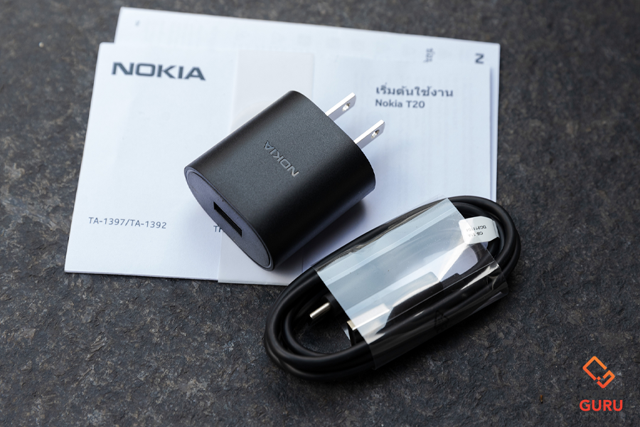 สำหรับอุปกรณ์เริ่มต้นใช้งานภายในกล่อง Nokia T20 นอกจากตัวเครื่องที่นอนอยู่ด้านบนสุดแล้ว จะมีสายชาร์จ USB-C , อแดปเตอร์ชาร์จไฟ, เข็มจิ้มซิม, ฟิล์มกันรอยใส, เคสแบบฝาพับและคู่มือการใช้งาน
