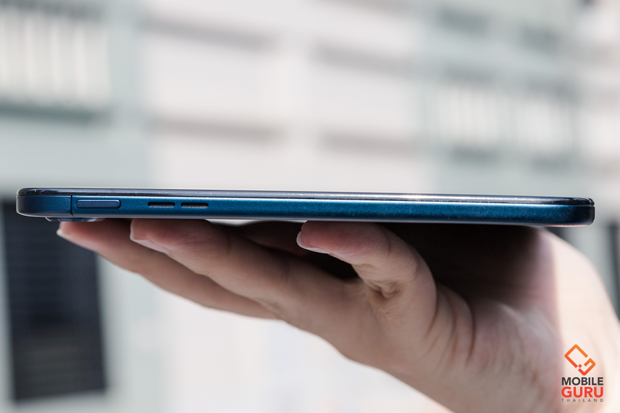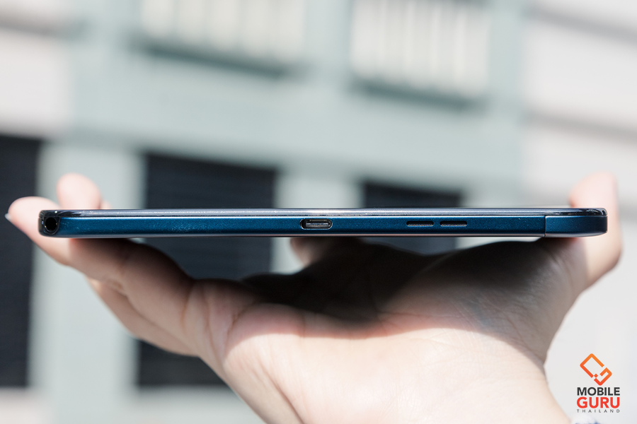 ด้านขวาตัวเครื่อง มีลำโพงเสียง OZO Audio ทำงานร่วมกับลำโพงฝั่งซ้ายในการสร้างมิติเสียงแบบสเตอริโอ ขยับลงมาจะเป็นพอร์ต USB-C และช่องรูเสียบชุดหูฟังแบบ 3.5 มิลลิเมตร วางตำแหน่งไว้ตรงมุมเครื่องพอดี ซึ่งมีข้อดีตรงเวลาเราเสียบสายหูฟังเพื่อใช้งาน ตัวสายหูฟังจะไม่งอหรือโดนกดทับเวลาใช้งาน