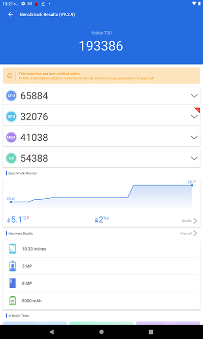 - ทดสอบประสิทธิภาพด้วยแอปพลิเคชั่น Antutu Benchmark ได้คะแนนรวม 193,386 คะแนน