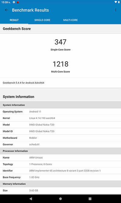 - ทดสอบประสิทธิภาพด้วยแอปพลิเคชั่น Geekbench 5 ได้คะแนน Single Core 347 คะแนน และ Multi-core 1218 คะแนน