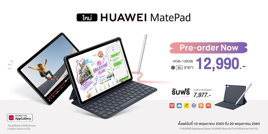 สามารถพรีออเดอร์ได้ตั้งแต่วันที่ 10 พฤษภาคม 2565 – 20 พฤษภาคม 2565 พร้อมรับฟรี HUAWEI Smart Keyboard (มูลค่า 2,290 บาท) และ HUAWEI M-Pencil Package 2nd generation (มูลค่า 4,490 บาท) และสิทธิประโยชน์อีกมากมาย สำหรับลูกค้า HUAWEI Mobile Service และแอปพลิเคชันต่างๆ (มูลค่ารวม 1,197 บาท) รวมมูลค่าทั้งหมด 7,977 บาท