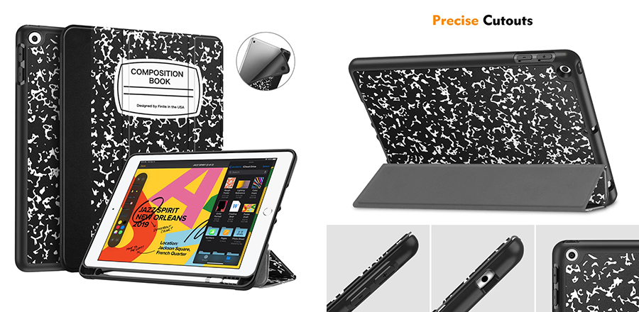 เคสไอแพด Composition Book ปกสมุดนักเรียนสุดคลาสสิกที่ดูคุ้นหน้าคุ้นตากันเป็นอย่างดี ความฮอตฮิตที่ถูกนำมารีดีไซน์แล้วในหลากหลายผลิตภัณฑ์ สำหรับเคสลายนี้ จริง ๆ มี ให้เลือกหลายแบรนด์เลยค่ะ แต่ที่เลือกมาแนะนำจะเป็นของ Fintie จากอเมริกา วัสดุทำจากหนัง PU และ TPU น้ำหนักเบา พับได้ 3 ทบ มีให้เลือกทั้งแบบธรรมดา แบบมีที่ใส่ปากกา และแบบมีคีย์บอร์ด ราคาจะแตกต่างกันตามสเปกและรุ่น iPad ที่เราเลือกค่ะ