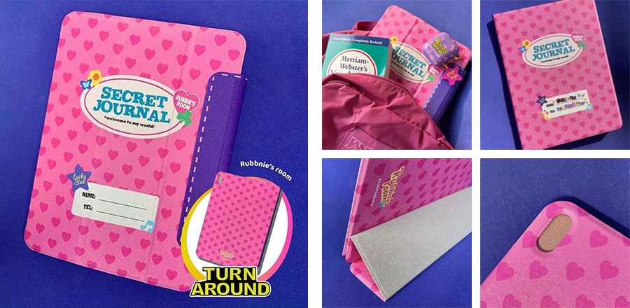 เคสใส่ไอแพด Secret Journal จาก Rubbie's Room กับลายปกสมุดนักเรียนสีชมพูฟรุ้งฟริ้ง แต่งรูปหัวใจ ฟีลเจ้าหญิงบาร์บี้ ให้ความรู้สึกสดใสเหมือนย้อนกลับไปช่วงยุค Colorful 80's สำหรับเคสรุ่นนี้มี 2 แบบ คือ แบบเคสแม่เหล็ก พับได้ 3 ทบ มีแถบแม่เหล็กสีม่วงสำหรับล็อกปก (ไม่มีช่องใส่ปากกา) และแบบคลุมเครื่อง มีช่องใส่ปากกา (ไม่มีแถบแม่เหล็กสีม่วง) ซึ่งแต่ละแบบก็มีให้เลือกใส่กับ iPad หลายรุ่นอยู่นะ