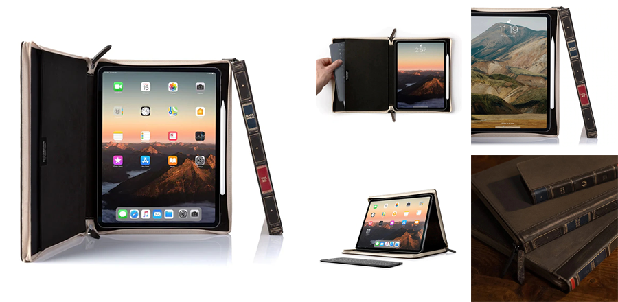 เคสไอแพดรุ่น BookBook จากแบรนด์ Twelve South ที่ออกแบบมาให้เหมือนกับปกตำราหนังสือย้อนยุคสไตล์อังกฤษ ตัวนี้ดีไซน์โดดเด่นมาก ๆ ประหนึ่งว่าเรากำลังถือหนังสือเตรียมเข้าไปเรียนที่ Hogwarts เลยทีเดียว มีให้เลือกหลายแบบ ทั้งแบบปกธรรมดา และแบบที่มีช่องใส่ของข้างในสำหรับไว้เก็บกระดาษจดโน๊ต, สายชาร์จ และคีย์บอร์ดได้ด้วย ราคาแตกต่างกันตามแบบที่เลือกและรุ่นของไอแพดค่ะ