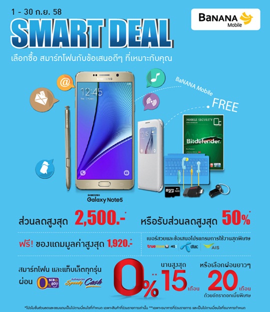 เลือกซื้อสมาร์ทโฟน แท็บเล็ต พร้อมรับข้อเสนอดีๆ ที่เหมาะกับคุณ กับโปรโมชั่น SMART DEAL ได้ตลอดเดือนกันยายนนี้ ที่ร้านบานาน่าโมบาย ทั่วประเทศ