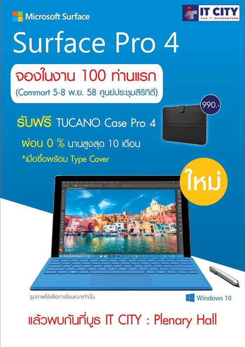 นอกจากนั้น คุณยังสามารถสัมผัสประสิทธิภาพสุดล้ำของ Surface Pro 4 อย่างใกล้ชิด ได้ที่งานคอมมาร์ต ตั้งแต่วันที่ 5 - 8 พฤศจิกายน นี้เป็นต้นไป โดย Surface Pro 4 จะเผยโฉมให้แฟนๆ ชาวไทยเห็นเป็นครั้งแรกที่บูธ IT City ณ Plenary Hall ศูนย์สิริกิติ์ และพิเศษ! สำหรับลูกค้าที่จอง Surface Pro 4 พร้อม Type Cover 100 ท่านแรก จะได้รับเคส TACUNA มูลค่า 990 บาทฟรี พร้อมสิทธิ์ผ่อน 0% 10 เดือน มัดจำเพียง 1,000 บาทเท่านั้น และเริ่มรับสินค้าได้ตั้งแต่วันที่ 19 พฤศจิกายน 2558 เป็นต้นไป ข้อมูลเพิ่มเติมสามารถเข้าไปดูได้ที่ www.facebook.com/itcitycare