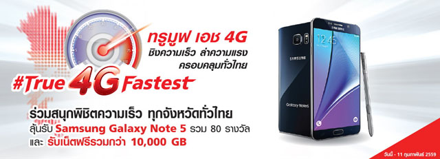 ร่วมสนุกง่าย ๆ เพียงแชร์ผลการทดสอบ Speed Test Download สูงสุดที่คุณทดสอบได้ ผ่านเฟซบุ๊ก อินสตาแกรม หรือทวิตเตอร์ พร้อมใส่ #True4GFastest ร่วมสนุกได้ทั้งแบบเติมเงินและรายเดือน ตั้งแต่วันนี้ - 11 กุมภาพันธ์ 2559 ประกาศรายชื่อผู้โชคดีรายสัปดาห์ทุกวันจันทร์ และประกาศรายชื่อผู้โชคดีที่ได้รับสมาร์ทโฟน Samsung Galaxy Note 5 ทั้ง 80 คน ในวันที่ 20 กุมภาพันธ์ 2559 ทาง http://www.truemove-h.com/True4Gfastest