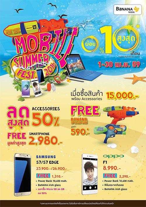 ช้อปสนุกแบบมีความสุขในช่วงวันหยุดนี้ กับโปรโมชั่น Mobile Summer Fest. 2016 โปรโมชั่นดับร้อน ให้คุณเป็นเจ้าของสินค้าไอทีได้ง่ายๆ เมื่อซื้อสินค้าภายในร้านพร้อม Accessories ครบ 15,000 บาท รับฟรีทันที BaNANA Splash Gun มูลค่า 590 บาท พร้อมผ่อน 0% นานสูงสุด 10 เดือน กับบัตรเครดิตที่ร่วมรายการ